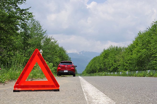 車から約50m後方に三角表示板を置き、後続車に注意を促します。見通しが悪い場所や悪天候の場合は、発煙筒も使って後続車に注意を呼びかけましょう。