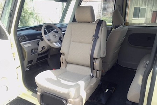 デモカーとして作った「タント」という軽自動車のモデルだと、後部座席まで全て開いたピラーレスの状態で椅子が降りてくるので、後部座席に車椅子を収納して、そのまま横移動の状態で運転席に乗車することが可能になります。